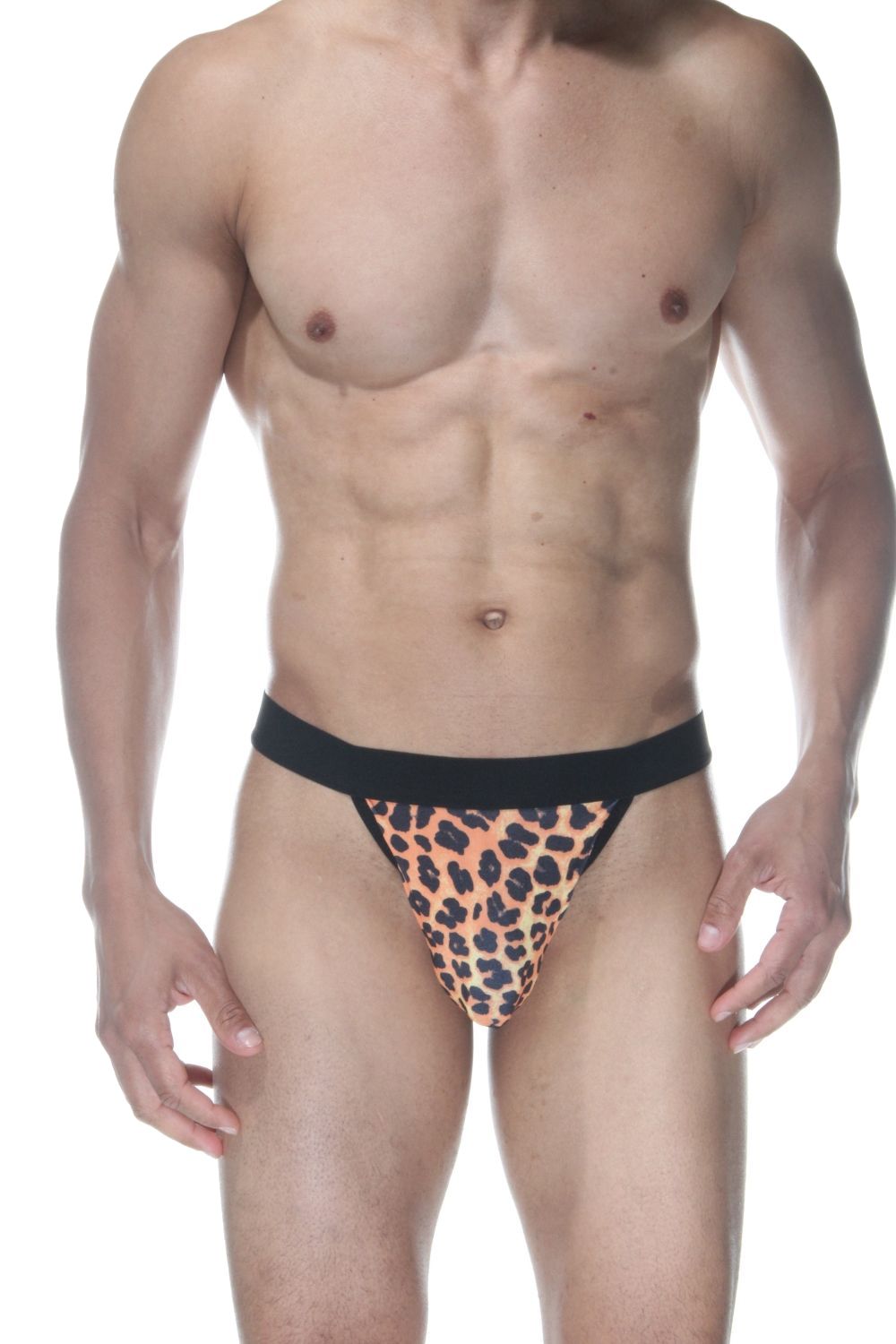 Мужские трусы-стринги с леопардовым принтом и широкой резинкой.
