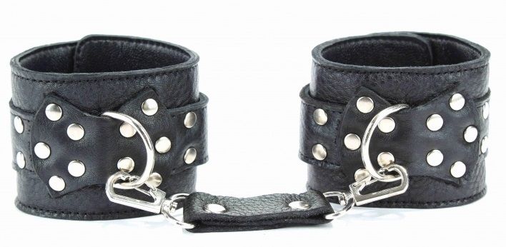 Кожаные наручники черного цвета. Украшены заклепками и соединяются между собой цепью с карабинами. Размер наручников регулируется при помощи застежки Ширина - 6 см. Длина цепочки - 15,5 см.