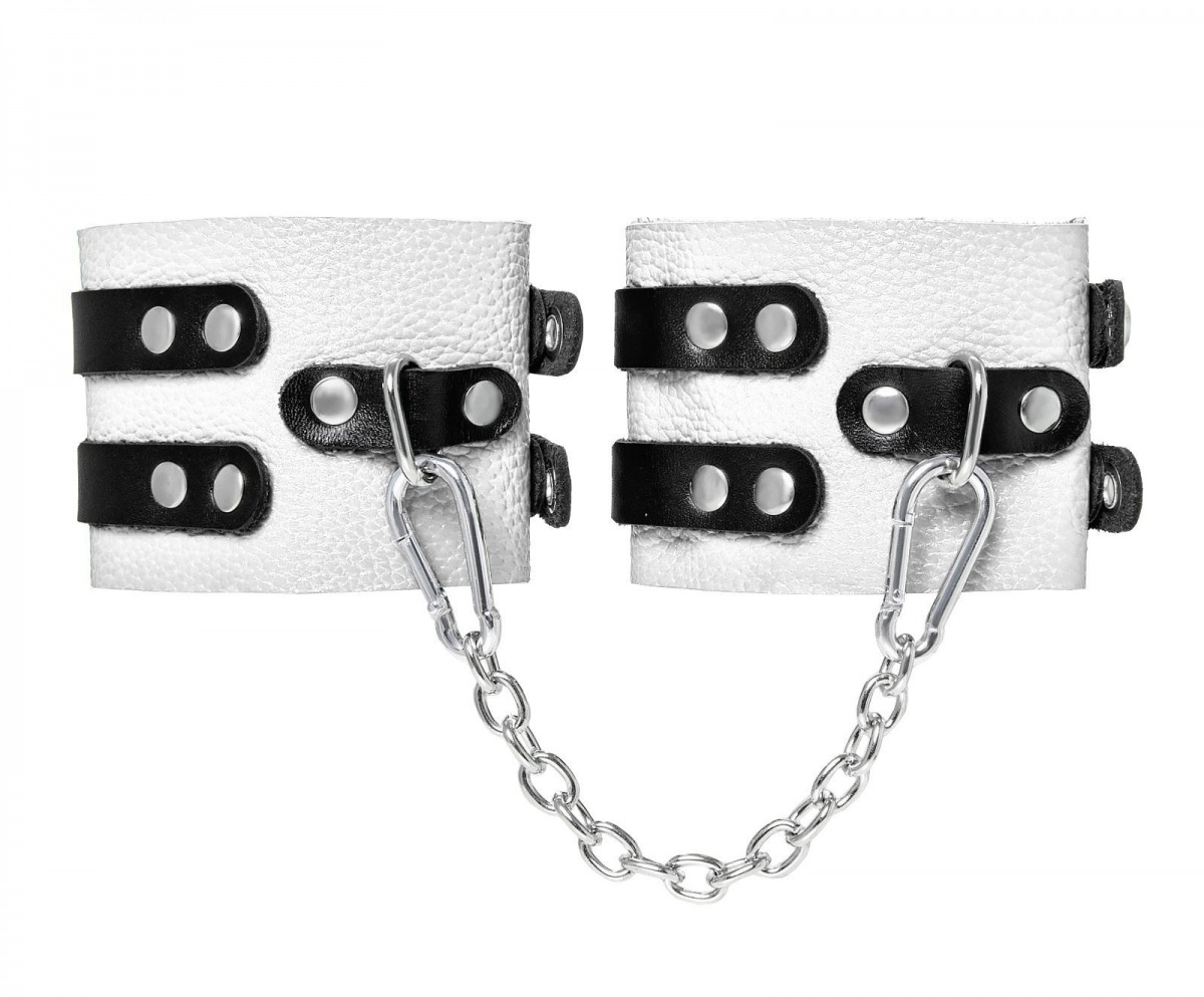 Мягкие оковы с двумя жёсткими ремешками от Pecado помогут обездвижить партнера во время сексуальных прелюдий или жестких БДСМ-играх. Оковы изготовлены полностью из белой, натуральной кожи. Ремешки выполнены из чёрной жёсткой кожи, украшены люверсами. Выделка материала произведена вручную. Ремешки и широкая манжета хорошо держат форму: не тянутся и не мнутся. Качественная металлическая фурнитура добавляет лоска изделию, а аромат натуральной кожи повышает градус возбуждения. Благодаря широкому запасу регулировок, можно подобрать необходимый обхват. Аксессуар удобно застегивать и легко расстегивать. При правильном использовании не оставляет следов на теле и не доставляет дискомфорта. Манжеты оков соединяются между собой помощью двух карабинов и съемной стальной цепочки. Подходит и для женских, и для мужских ног. Длина манжет - 25 см, ширина - 7 см. Длина сцепки - 20 см.