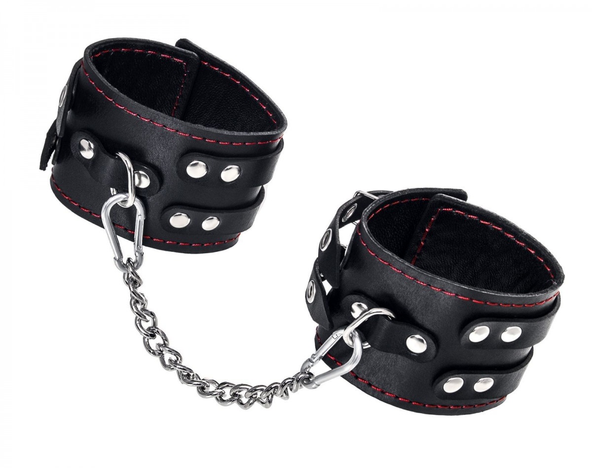 Эти кожаные оковы с двумя ремнями и чёрной подкладкой могут стать стильным аксессуаром, а могут послужить вашим целям по своему прямому назначению. Частичное обездвиживание и невозможность двигать руками или ногами дают вам полную власть над партнером – взрослые игры для взрослых. Наличие двух колец и карабинов, соединенных между собой металлической цепочкой, позволяет использовать изделие как раздельно – аксессуар-манжеты, так и как оковы для фиксации. К широким металлическим кольцам также можно присоединить и другие аксессуары при помощи карабинов. Благодаря универсальному размеру оковы могут использоваться и мужчинами, и женщинами. Размер легко регулируется с помощью металлических пряжек, органично вписывающихся в общий стиль. Длина манжет - 25 см, ширина - 7 см. Длина сцепки - 20 см.
