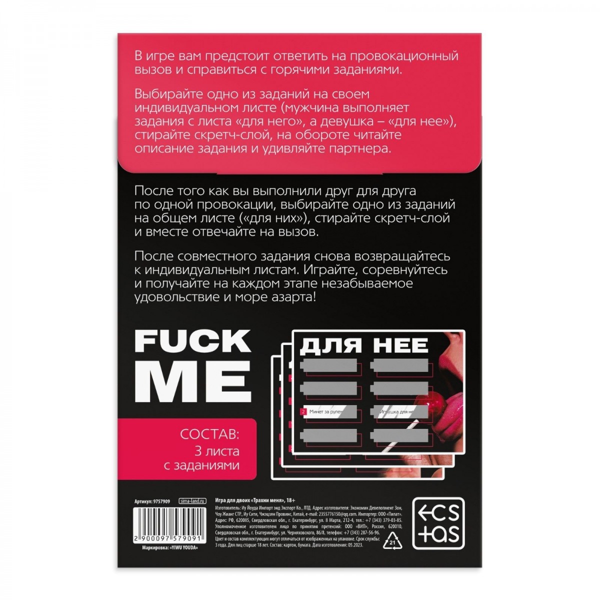 В секс-шопе Orgasmix вы можете купить Игра для двоих «Трахни меня» со скретч-слоем артикул 366223 по цене руб. с доставкой в город Вологда. Мы осуществляем доставку по всей России. Ближайшая дата отправки этого товара . Заказы принимаются круглосуточно через интернет-магазин.