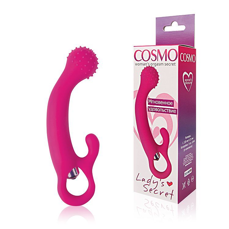 Шикарный вибромассажер из коллекции Cosmo подарит множество новых, ярких эмоций! Фантазийная форма вагинального стимулятора с пупырышками на конце и специальным отростком для массажа клитора сделают любовные игры невероятно страстными и чувственными. Добавит возбуждающего эффекта режим «вибрация». Эротический аксессуар изготовлен из безопасного материала - гипоаллергенного силикона. Вибромассажер имеет мягкую, приятную на ощупь текстуру. Удобная форма и комфортные размеры позволяет легко вводить, а ограничительное кольцо извлекать секс-игрушку.